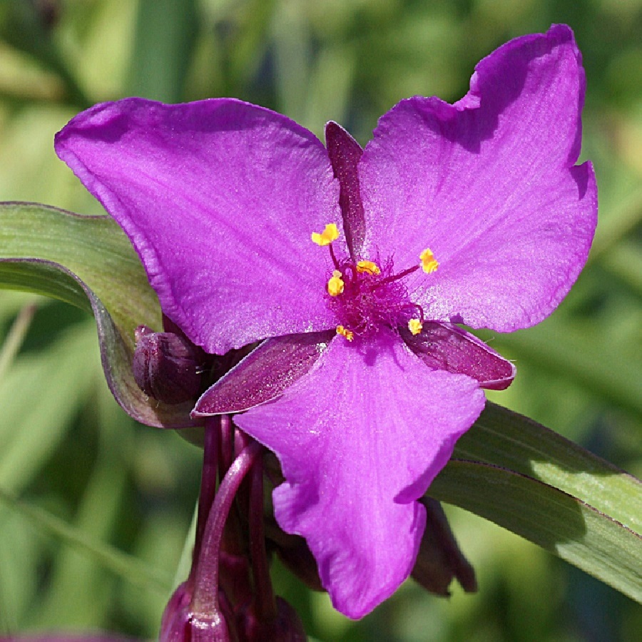 Традесканция Андерсона Ред Грейп (Tradescantia Andersoniana Red Grape) не теряет свои декоративные качества на протяжении долгого времени. Период цветения традесканции - с конца весеннего периода до начала осени. Прямостоячие стебли, усыпанные листьями по всей длине, достигают высоты до 40-50 сантиметров. Листочки линейно-ланцетные, темно-зеленые с синеватым оттенком. Зонтиковидные соцветия состоят из трехлепестковых цветков. Они плоские, малиново-фиолетового цвета, диаметром до 4 сантиметров. По центру находятся тычинки с ярко-желтыми головками. К почвам Традесканция Андерсона Ред Грейп не требовательна, но предпочтение следует отдавать легким, хорошо увлажненным почвам на слегка притененных участках.