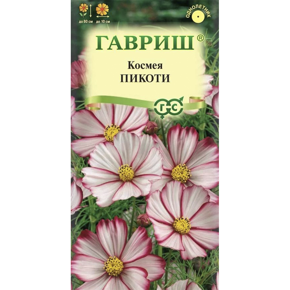 Роскошное однолетнее растение из семейства Астровые, высотой до 80 см. Пышный куст с ажурными листьями покрывают белые цветки, диаметром 10 см, с эффектной карминно-красной каймой по краю лепестков. Цветет обильно с июля до заморозков. Космея холодостойка и светолюбива, относительно засухоустойчива. К почвам нетребовательна, предпочитает рыхлые, умеренно плодородные почвы. Выращивают прямым посевом в грунт в конце апреля-начале мая, либо под зиму. Используется для посадки на клумбах, в миксбордерах для декорирования оград и стен зданий, высаживают в качестве заднего фона бордюра. Успешно распространяется самосевом.