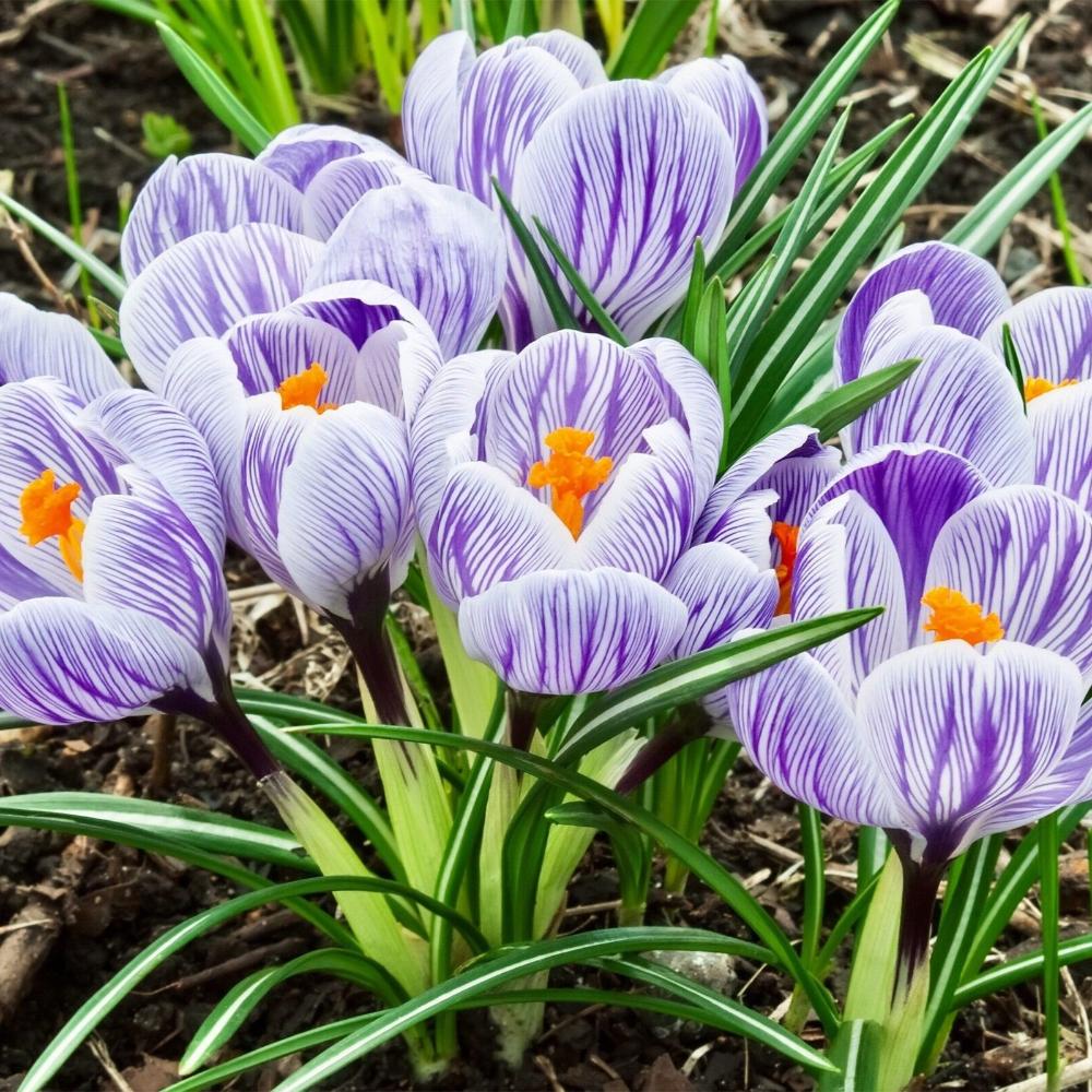 Крокус Striped - многолетнее декоративное растение. Цветки бокаловидные, маленькие, с овальными лепестками. Их размер - до 4 см. Окраска лепестков сетчатая: на светло-сером фоне выделяются густо-сиреневые штрихи. Трубка темно-сиреневая. Пыльники желтые.
