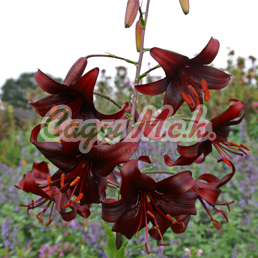 Луковицы лилии азиатской Дарк Секрет (Dark Secret) уместно разместить для контраста на клумбе с преобладанием белых цветов. Растение обладает крупными бутонами насыщенного вишнево-бордового цвета, отливающего синевой. Длинные пурпурные тычинки с оранжевыми головками только подчеркивают глубокий оттенок лепестков. Длина цветоноса лилии этого сорта 100 сантиметров. Уже в июне на растении раскрываются цветы диаметром 16 сантиметров. Цветение продолжается 2 месяца. Одновременно на стебле раскрываются до 5 бутонов. Лилия азиатская Дарк Секрет подходит для выращивания во всех климатических зонах, кроме Крайнего севера.