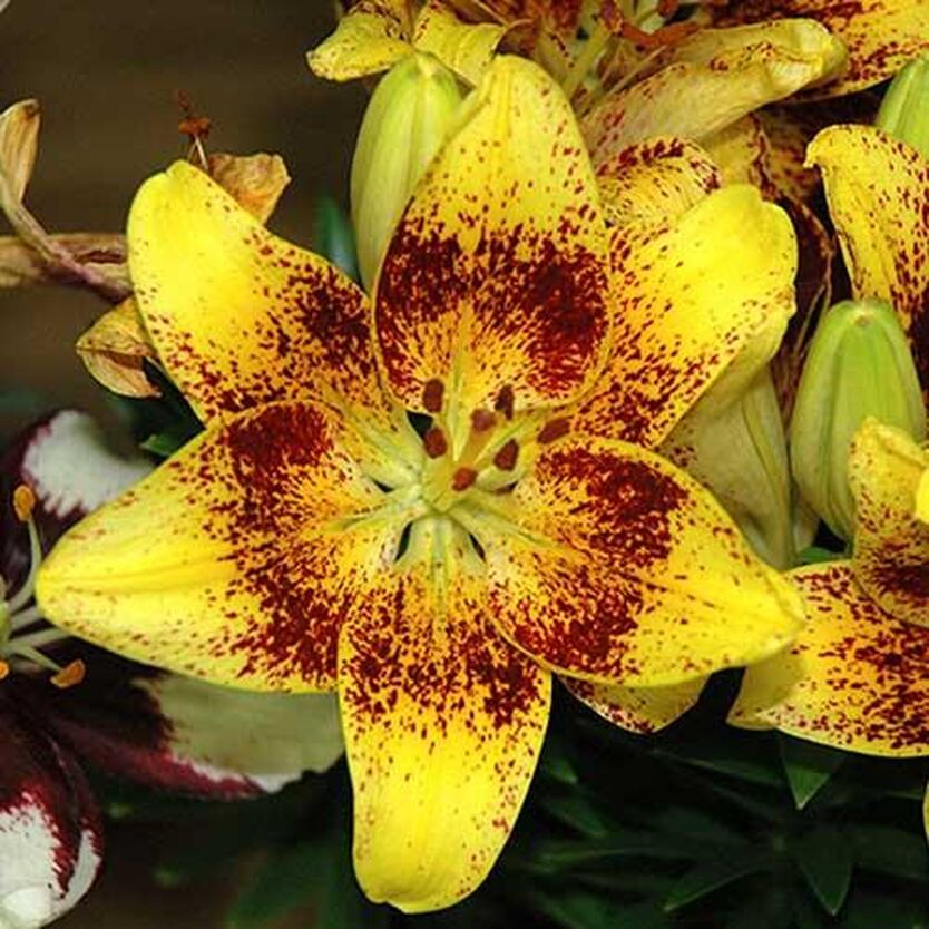 Луковицы Лилии азиатской горшечной Тайни Наггет (Lilium asiatic Tiny Nugget) относятся к низкорослым сортам, подходящим для выращивания даже дома на подоконнике или на балконе. Несмотря на небольшие размеры, лилия порадует крупными цветками, достигающими в диаметре 16 см. Но особого внимания заслуживает их расцветка: на стебле распускаются ярко-желтые цветы, лепестки которых от основания до кончиков покрывает густой бордовый крап. Лилия азиатская горшечная Тайни Наггет удачно смотрится в групповой посадке среди невысоких цветов, выделяясь контрастной расцветкой лепестков и густой зеленью плотно облиственных стеблей.