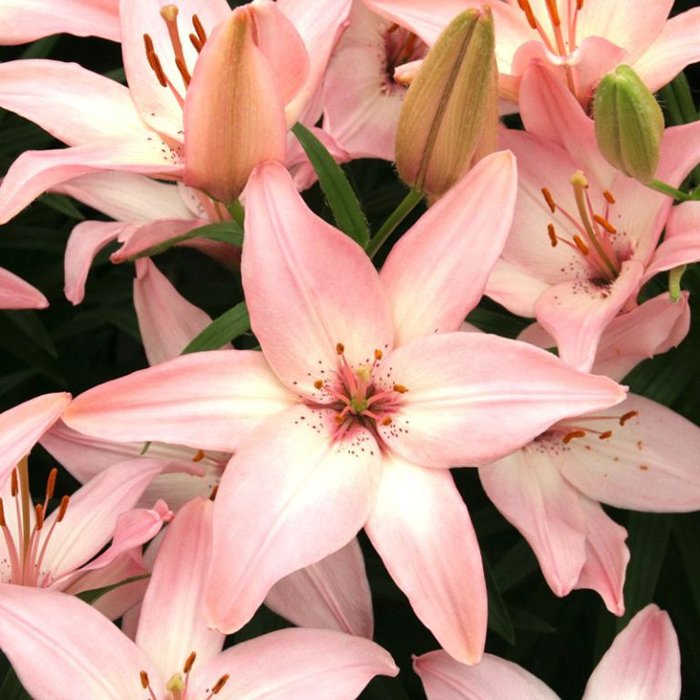 Луковицы азиатской лилии Хэппи Спринг (Lilium asiatic Happy Spring) привлекательны для цветоводов нежной окраской. Сорт низкорослый. Прочные, густооблиственные стебли вырастают до 60 см в высоту. Окраска нежно-розовая, от центра расходятся кремовые мазки, на которых отчетливо виден пурпурный крап. Пыльники горчичного цвета. Лилия используется для украшения клумб и на срезку. Также может выращиваться в кашпо. Предпочитает рыхлые, плодородные почвы. Для лучшей бутонизации Лилии азиатской Хэппи Спринг рекомендуется высаживать на солнечных участках или в полутени. Растение нуждается в умеренном поливе.