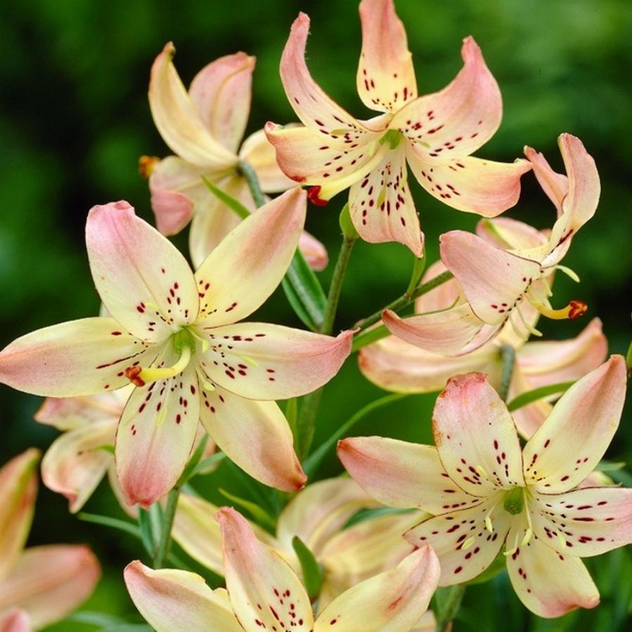 Луковицы лилии азиатской Корсаж (Corsage) могут пополнить коллекцию даже неопытного цветовода. Эта группа сортов неприхотлива, зимостойка, но обладает привлекательным и ярким цветением. Изящный цветок лилии состоит из узких, отогнутых назад лепестков, окрашенных в кремово-розовый оттенок, который становится ярче к кончикам. По всей поверхности бутона рассыпан бордовый крап, придающий цветку особое очарование. Высота лилии Корсаж 80 сантиметров. Стволик прочный, покрыт узкой зелёной листвой. Цветки образуются на тонких цветоножках, изящно склоняясь вниз. Одновременно на Лилии азиатской Корсаж раскрывается до 8 бутонов.