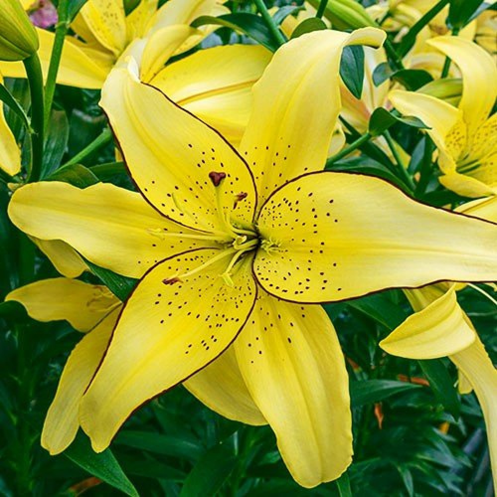 - Характеристики ярко-желтый с бордовым кантом по краям лепестков. В центре крупный крап, диаметр цветка 15 см