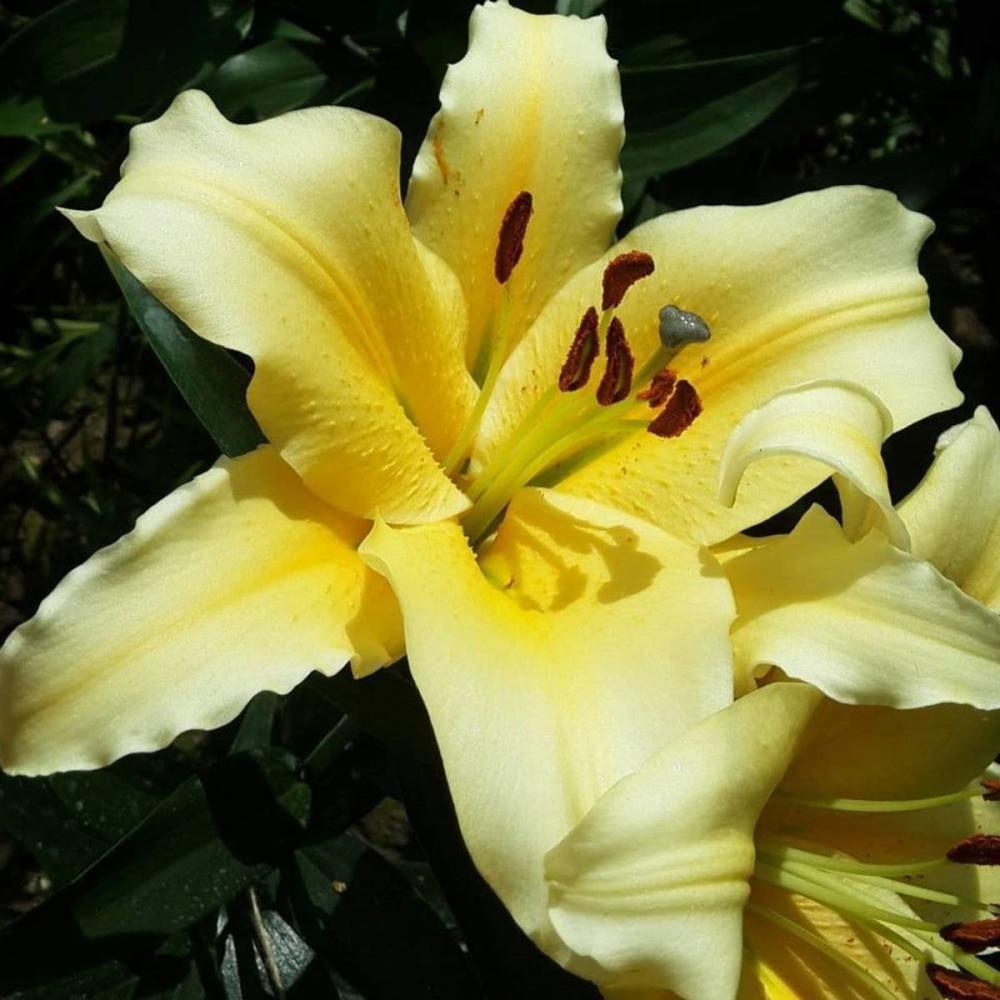 Лилия ОТ-гибрид Конка д'Ор (Lilium) принадлежит к гибридной группе морозостойких цветов, обладающих поразительной красотой невероятно сладким и нежным ароматом. На прочных высокорослых стеблях светло-зеленого оттенка, достигающих отметки 110 сантиметров, располагаются гладкие листья и до 30 крупных соцветий. Их воронковидная форма с широкими раскидистыми чашечками нежного желтого цвета направлена вверх, а волнистые белоснежные кончики загнуты книзу. Такая яркая композиция станет гармоничным дополнением любого букета, садового участка, клумбы или миксбордера.