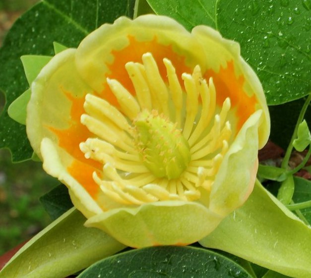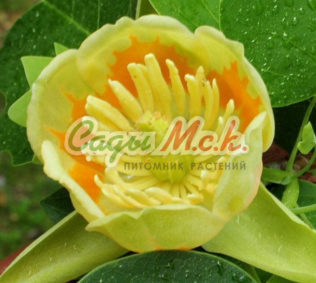 Лириодендрон Glen Gold - красивый, необычный сорт, с великолепными цветами. Желто-зеленые, с оранжевой маркировкой, чашевидные цветки появляются на ветвях поздней весной, придавая дереву необыкновенный вид. Период цветения  длительный - июнь - июль. Высота растения от 20 м. Дерево большое, раскидистое.