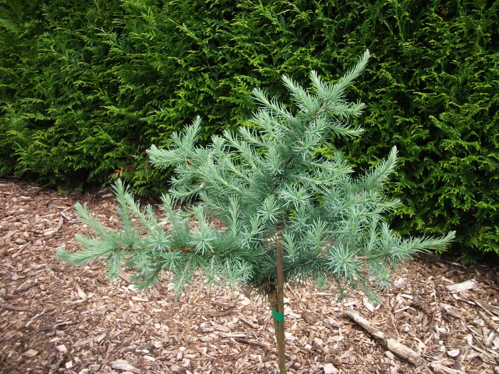 Медленно растущий кустарник на штамбе высотой и диаметром 130 см. В раннем возрасте требует опоры. В основном выращивается в штамбовой форме, высота зависит от места прививки. Крона нерегулярная, сплющенная, иногда коническая, очень плотная. Молодые побеги красно-коричневые, особенно декоративные в зимний период. Хвоя мягкая, светло-зелёная с голубоватым оттенком, 2-3 см длиной, осенью желтеет. Место солнечное или полутенистое. Почва умеренно влажная, дренированная