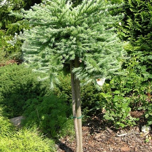 Высота 0,6 м, ширина кроны 0,6 м в возрасте 10 лет. Карликовая форма, компактная, обычно прививка на штамбе. Хвоя мягкая, небесно-голубая, длинные, осенняя окраска желтая. Побеги тонкие, изящные.