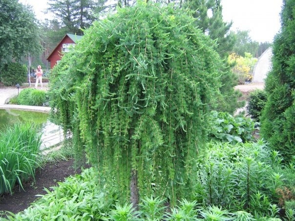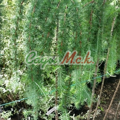 Сорт с побегами стелющимися по земле, штамбовая форма. Высота зависит от места прививки, штамб 1 - 2 метров. Побеги покрыты сине-зеленой хвоей, на зиму хвоя опадает. Предпочитает плодородные, умеренно влажные почвы