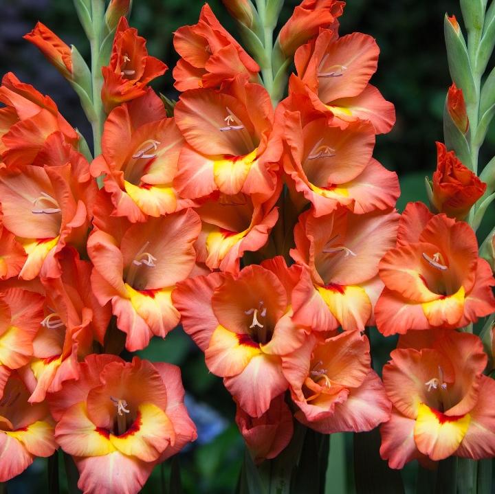 Гладиолус бамбино Селин (Gladiolus). Его цвет трудно описать, обычно его называют лососёво-розовым, и только один нижний лепесток отличается: он весь жёлтый, с горделивым красным пятнышком.