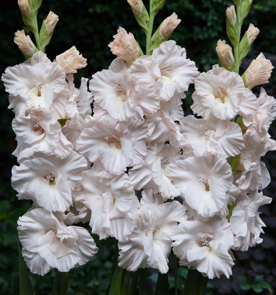 Гладиолус гофрированный Марш Раффл (Gladiolus) предназначен для высадки на декоративных клумбах, в виде сформированного узора. Высота стебля требует подвязки, но групповая посадка избавит от таких хлопот. Один стебель вмещает до 20 бутонов среднего размера. Цветки пышные, заложенные складочками в виде гофры. Расцветка в основном кремовая со светло-розовым напылением.