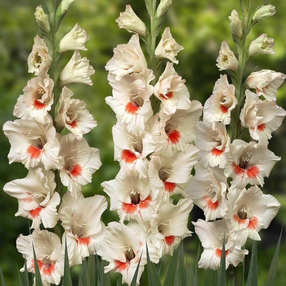 Луковицы гладиолуса крупноцветкового Аякс (Ajax) не зря носят имя героя Троянской войны. Крепкие цветоносы, высотой 1 метр, несут на себе крупные гофрированные цветки кремово-белой окраски с алым пятном у горловины. Привлекательное растение идеально сочетается на клумбе с цветами белой, огненной и ярко-жёлтой расцветки, создавая праздничное настроение. Ширина раскрытого цветка Аякса достигает 16 сантиметров. На стебле одновременно раскрывается до 12 бутонов. Цветение у Гладиолуса крупноцветкового Аякс раннее, июльское. Сорт используют для выгонки.