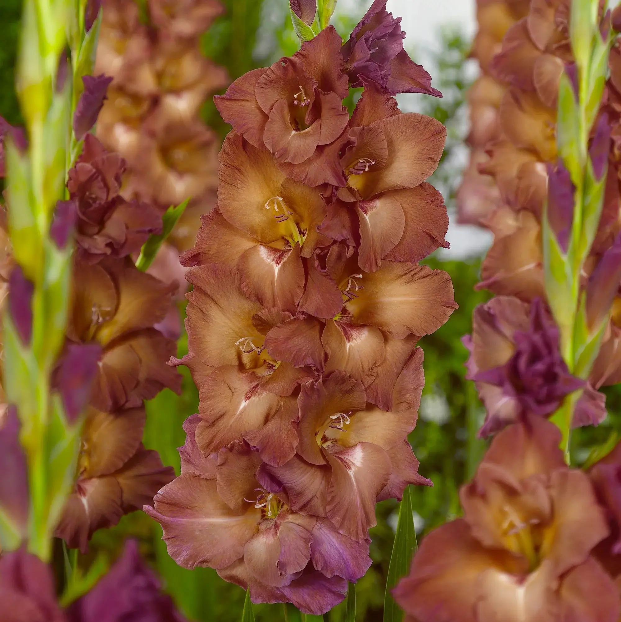 Луковицы гладиолуса крупноцветкового Индиан Саммер (Indian Summer) поражают необычной окраской крупных бутонов с волнистым краем. Цветок имеет бронзовый цвет разной интенсивности: у горла в нём присутствует жёлтый оттенок, ближе к краям лепестки отливают сиреневым. Сорт отличается большим количеством бутонов на цветоносе – до 20, что делает его идеальным для срезки. Высота растения 120 сантиметров. В саду разместите Гладиолусы крупноцветковые Индиан Саммер на заднем ряду миксбордера, дополнив композицию белыми лилиями, люпинами, светло-сиреневыми маками. Нежные оттенки соседей выгодно оттенят глубокую окраску гладиолуса.