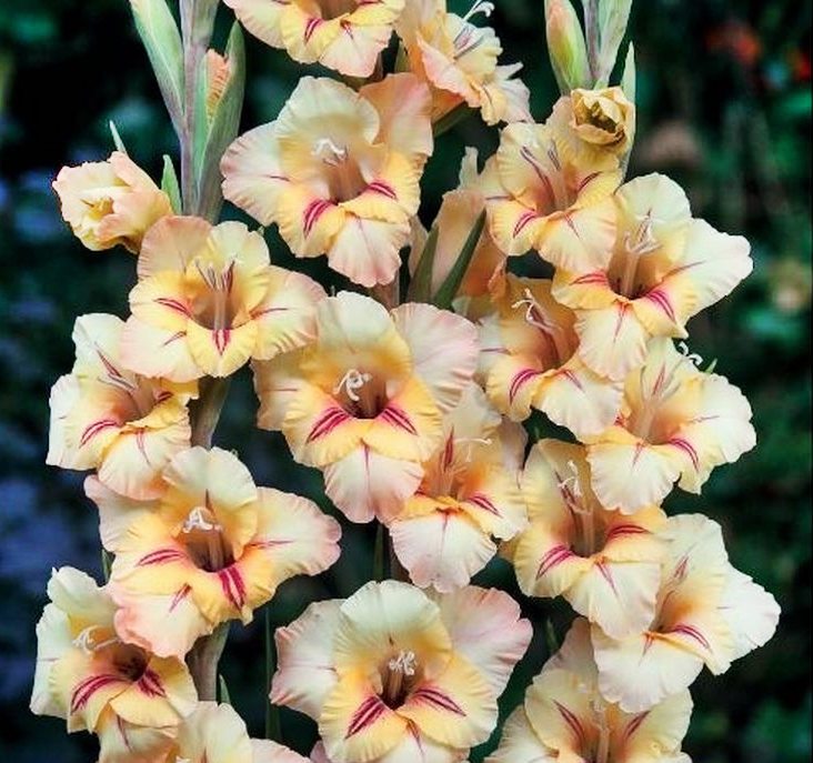 Гладиолус крупноцветковый Роза (Gladiolus) отличается оригинальной расцветкой: на персиковом (лососевом) фоне — яркая красная центральная полоска. Соцветье плотное, до 80 см длиной, сам цветок крупный, до 140 см высотой.