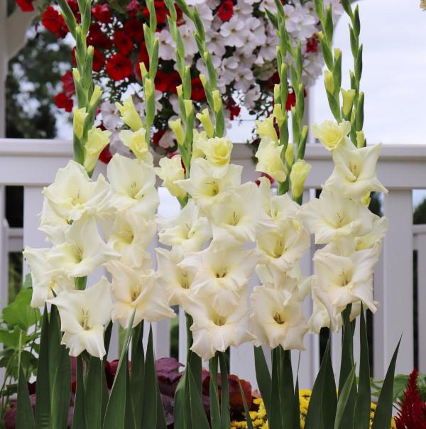 Луковицы гладиолуса крупноцветкового Спид Дейт (Speed Date) пополнят коллекцию сортов с кремово-зеленоватыми лепестками. Цвет более интенсивен у горла и на нижней юбке бутона. Нежное очарование крупных воронковидных цветков никого не оставит равнодушным. Растение гармонично смотрится в компании сортов с белой окраской бутонов, создавая нежную и воздушную композицию. Сорт прекрасно стоит в срезке до 2 недель. Высота Гладиолуса крупноцветкового Спид Дейт от 90 до 120 сантиметров. Длина колоса 60 сантиметров, ему необходима опора. В июле на цветоносе раскрывается до 13 бутонов с тонкими шелковистыми лепестками.