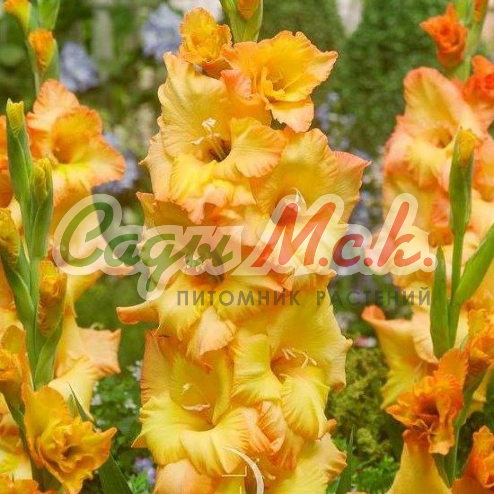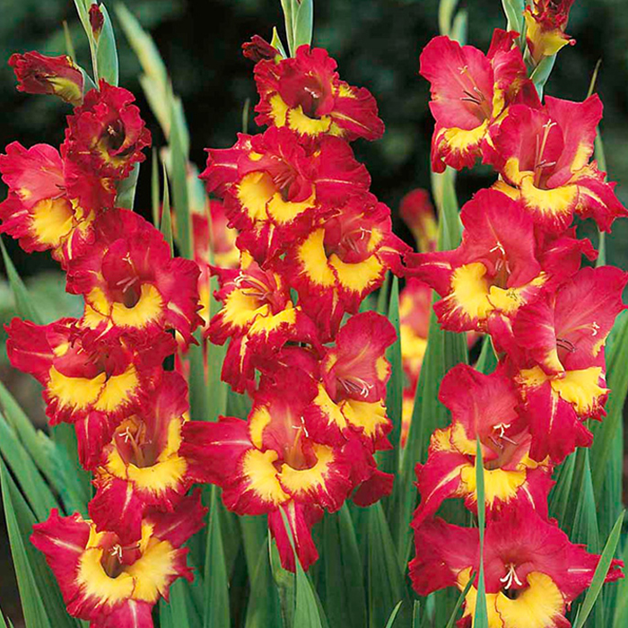 Луковицы гладиолуса крупноцветкового Стерео (Stereo) никого не оставят равнодушным. Смелое сочетание огненно-красного и желтого оттенков в одном цветке придадут клумбе яркости и света. Чтобы декоративный эффект от растения в цветнике был максимальным, гладиолус высаживают группами по 5 или 8 штук. Высота стебля составляет от 90 до 110 сантиметров, поэтому подвязывать цветоносы не обязательно. В конце июля на Гладиолусе крупноцветковом Стерео распускаются от 7 до 10 цветков со слабоволнистыми лепестками. Сочный оттенок бутонов отлично сочетается с изумрудной зеленью узких листьев гладиолуса.
