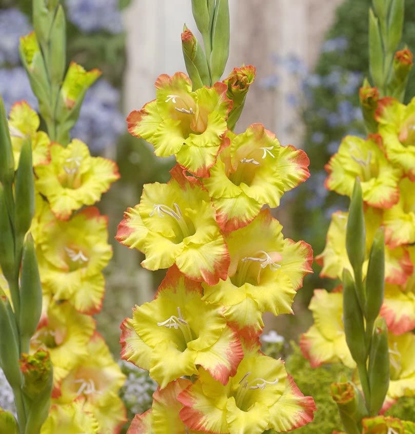 Гладиолус "Йоенна" - крупноцветковый сорт. Цветки крупные, собранные в колосовидные соцветия, желто-салатового цвета с коралловой каймой. Гладиолус неприхотлив в выращивании, легко размножается клубнелуковицами или клубнепочками. Любит обильный полив, после полива почву вокруг растения взрыхляют и окучивают. Перед посадкой в почву рекомендуется внести минеральное удобрение для луковичных цветов, хорошо взрыхлить и дренировать. Осенью Гладиолус крупноцветковый Йоенна выкапывают, обрезают стебли и корни, очищают от излишек земли, тщательно просушивают на протяжении месяца при комнатной температуре, упаковывают в бумажные салфетки и складывают в полиэтиленовый пакет с дырочками, убирают на хранение в подвал или холодильную камеру на нижнюю полку.