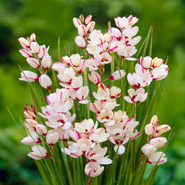 Луковицы иксии гибридной Спотлайт высаживают на хорошо освещенных участках, защищенных от ветра. Высота взрослого растения 0,3 метра, диаметр одного цветка — 4 сантиметра. Культура гармонично смотрится в групповых посадках, на клумбах, рабатках, миксбордерах, каменистых садах. Используется в качестве естественного обрамления территории. Первые цветы кремово-белого оттенка с розовым основанием распускаются в июне и радуют до конца августа. Листья нежно-зеленого цвета, линейной формы. Цветы долго «живут» после среза, до 2 недель. Благодаря этой особенности Иксия гибридная Спотлайт завоевала любовь флористов.