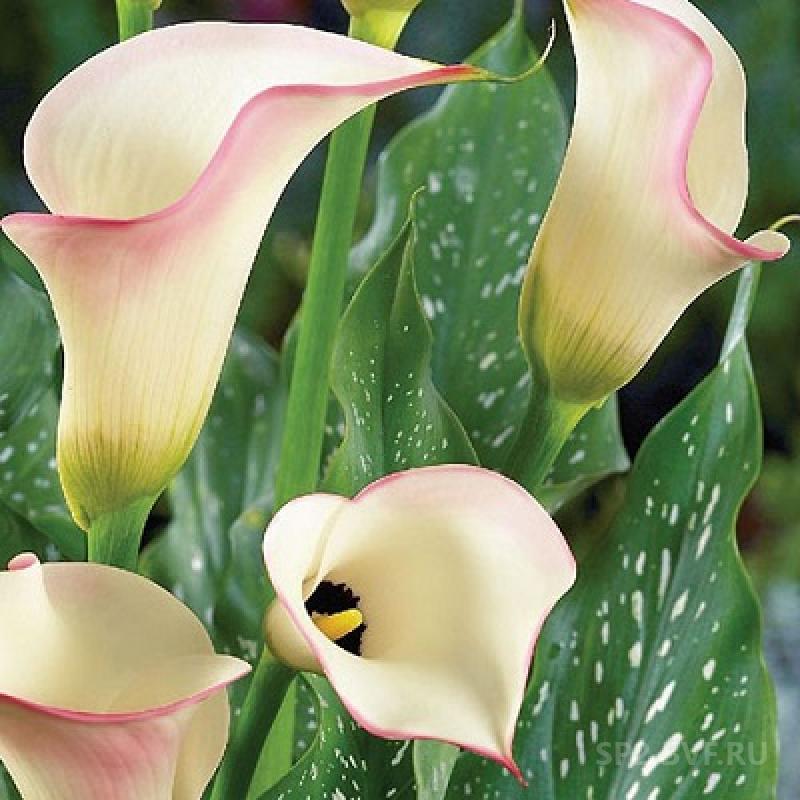 Клубни Каллы обыкновенной Бразилия (Calla Brasilia) отлично справятся с задачей оформления внешнего вида придомовой зоны, сада, искусственных водоемов, террас и помещений (в горшках) в течение 1,5 месяца (с середины лета). Многолетник вырастает до 45 сантиметров, обладает восковыми вытянутыми крупными листьями с сочной зеленью и мелкими серебристыми вкраплениями. Крепкий цветонос несет моносоцветие в виде желтоватого початка, обрамленного в воронковидный лист. Каллы данного сорта имеют нежный и утонченный бело-розовый оттенок. Растение неприхотливо, но на период роста требует полив и подкормку, солнечные места с затенением. На зимовку Каллу Бразилия извлекают из почвы на хранение.