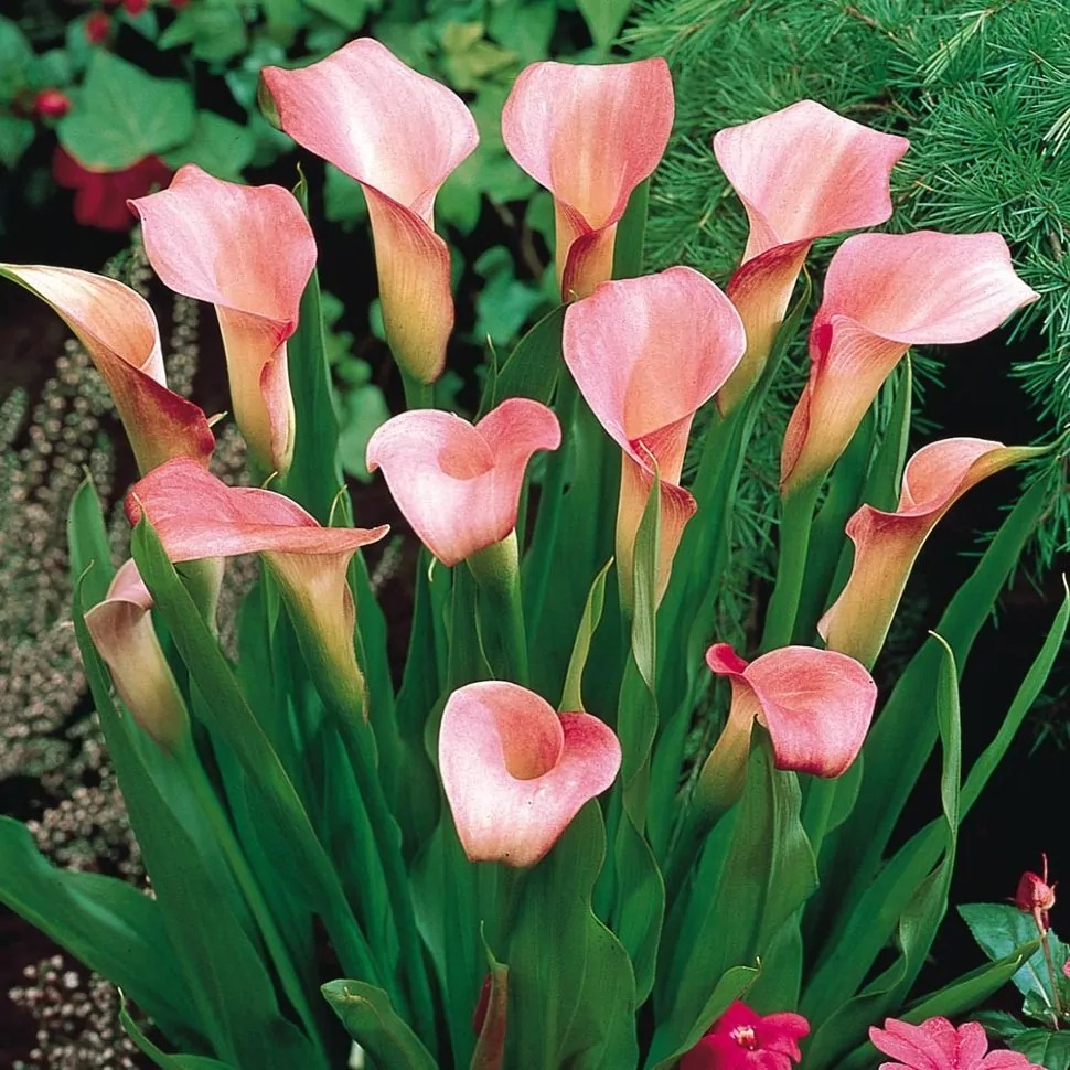 Клубни Каллы обыкновенной Ремани Пинк (Calla Rehmannii Pink) отличаются быстрым ростом. Растение подходит для оформления клумб, садовых водоемов, фонтанов. Сорт гармонирует с другими видами цветов. Многолетник достигает 50-60 сантиметров в высоту, у него насыщенные зеленые листья стрелообразной формы с восковым налетом. Крепкий и длинный цветонос имеет одно соцветие початковой формы и воронкообразную вытянутость. Нежно-розовые крупные цветки на фоне зелени смотрятся эффектно и статусно, они прекрасно стоят срезанные в букетах. Растение любит затененные места, регулярный полив с дренажем и подкормки. Калла Ремани Пинк не зимует в почве, ее необходимо выкопать для хранения в темном и прохладном месте.