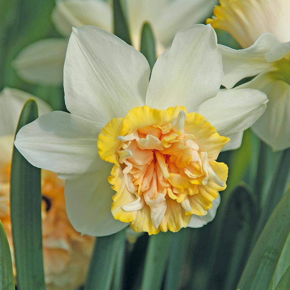 Нарцисс Петит Фо - махровый, многолетний сорт. Цветки с очень приятным, насыщенным ароматом, крупного размера, белоснежного цвета с гофрированной короной по центру розово-лососевого оттенка. Луковицы нарциссов среднего размера, отлично приживаются при любых климатических условиях. Растение неприхотливое в выращивании, стебель прямостоячий, крепкий. Нарцисс Петит Фо пользуется особой популярностью в декоративном садоводстве, их используют в озеленении, выращивают в открытом грунте на клумбах.