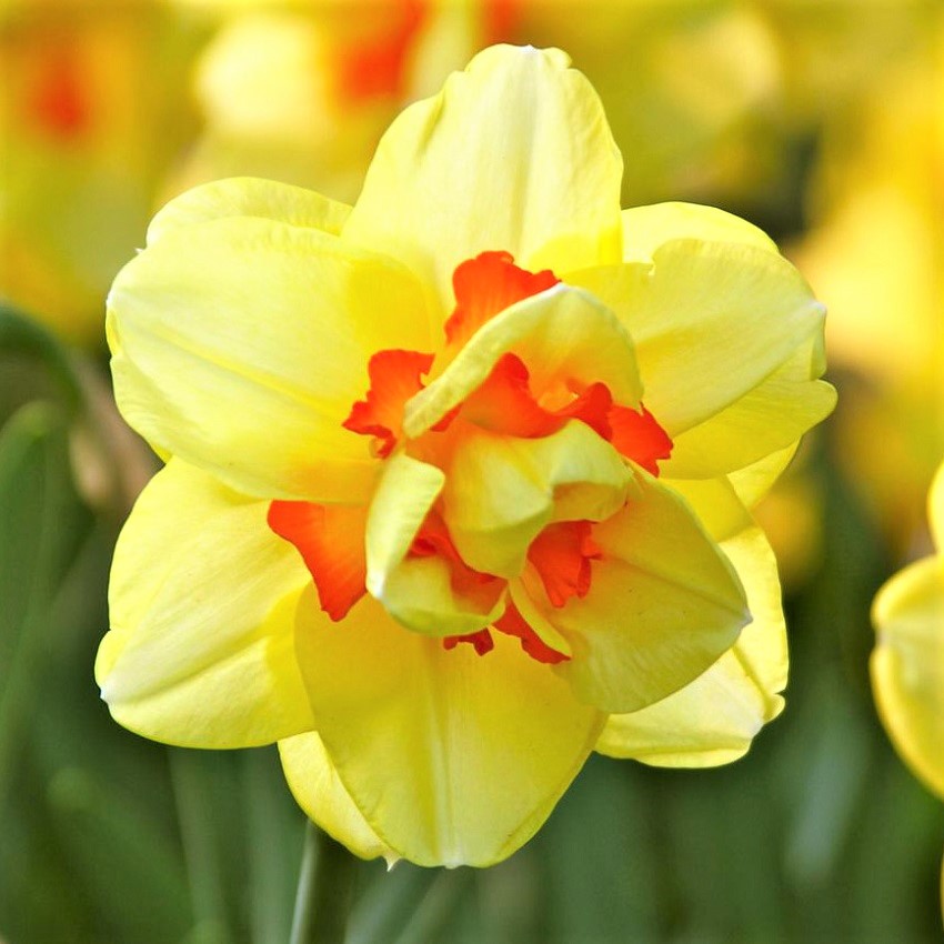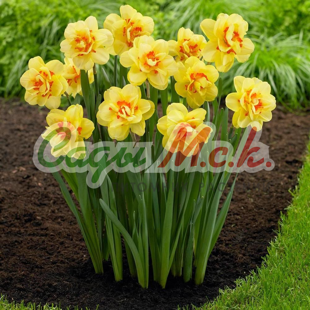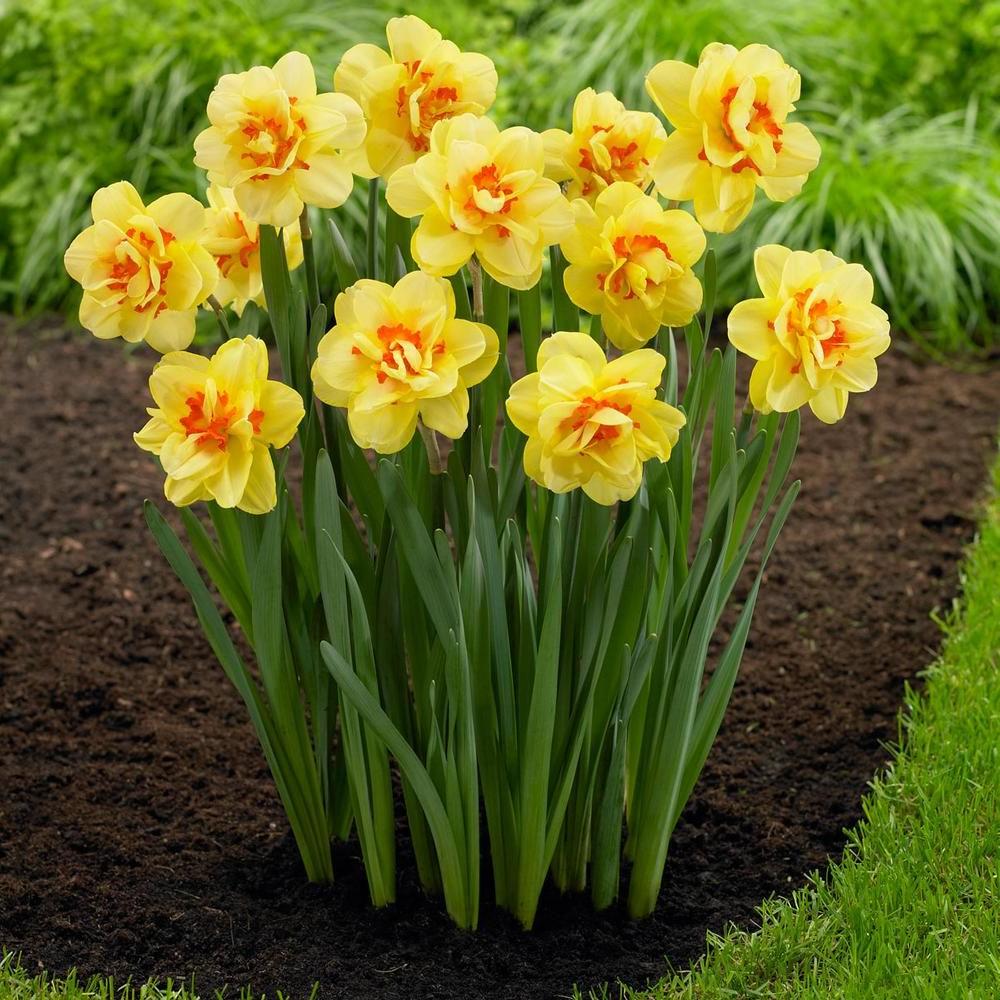 Нарцисс Таити - махровый, многолетний сорт. В начале цветения имеет яркий окрас, к концу цветения приобретает более бледный оттенок. Цветки с очень приятным, насыщенным ароматом, крупного размера, жёлтого цвета с красной короной по центру. Луковицы нарциссов среднего размера, отлично приживаются при любых климатических условиях. Нарцисс Таити неприхотлив в выращивании, стебель прямостоячий, крепкий. Махровые нарциссы пользуются особой популярностью в декоративном садоводстве, их используют в озеленении, выращивают в открытом грунте на клумбах.
