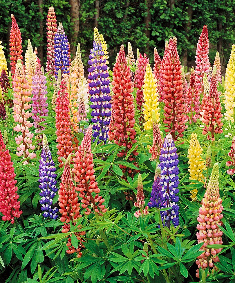 Люпин Минарет – специально подобранная смесь невысоких люпинов (высотой 50 см), идеальная для центральной композиции в миксбордерах, на клумбах, вдоль декоративных заборчиков или рядом с домом. Буйство красок подойдет для самостоятельной, сольной угловой клумбы. Цвета соцветий по-настоящему летние: насыщенный лимонный, розово-пурпурный, синий, рубиновый, розово-белый, желто-розовый, жёлто-фиолетовый, белый и пр. При этом все цвета вертикальных соцветий очень красочно сочетаются друг с другом. Тем более, что сегодня комбинация разных оттенков в одной композиции очень модна.