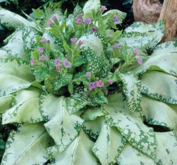 Медуница Silverado. На листьях большая центральная часть серебряная, край листа со своеобразной зелёной каймой. На одном растении можно видеть белые, голубые и розовые цветки.