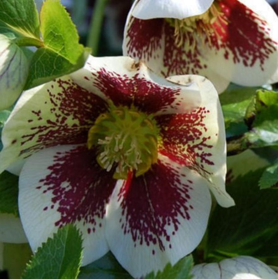 Морозник White Lady Spotted - вечнозеленый многолетник до 50 см высотой. Листья зимующие, очень плотные, кожистые, благородного темно-зеленого цвета. Цветение обильное.  Цветы белые, обильно испещренные темно-красными краплениями в центрах. Морозостойкий сорт.