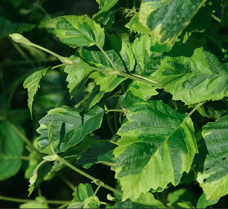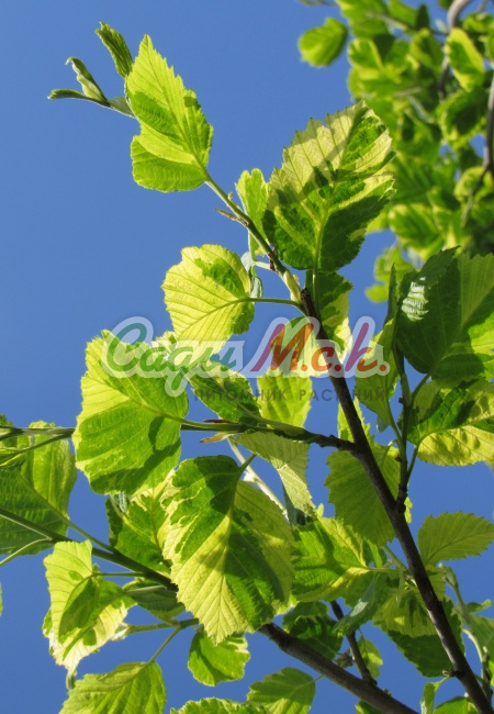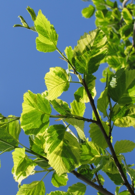 Форма и окраска листьев: листья яйцевидные, 4-10 см, заострённые, округлые у основания, дважды зубчатые. Весной зелёные, с нерегулярной жёлтой каймой, летом становится зелёно-жёлтыми, верхняя сторона листа голая, снизу светлая и волосатая.