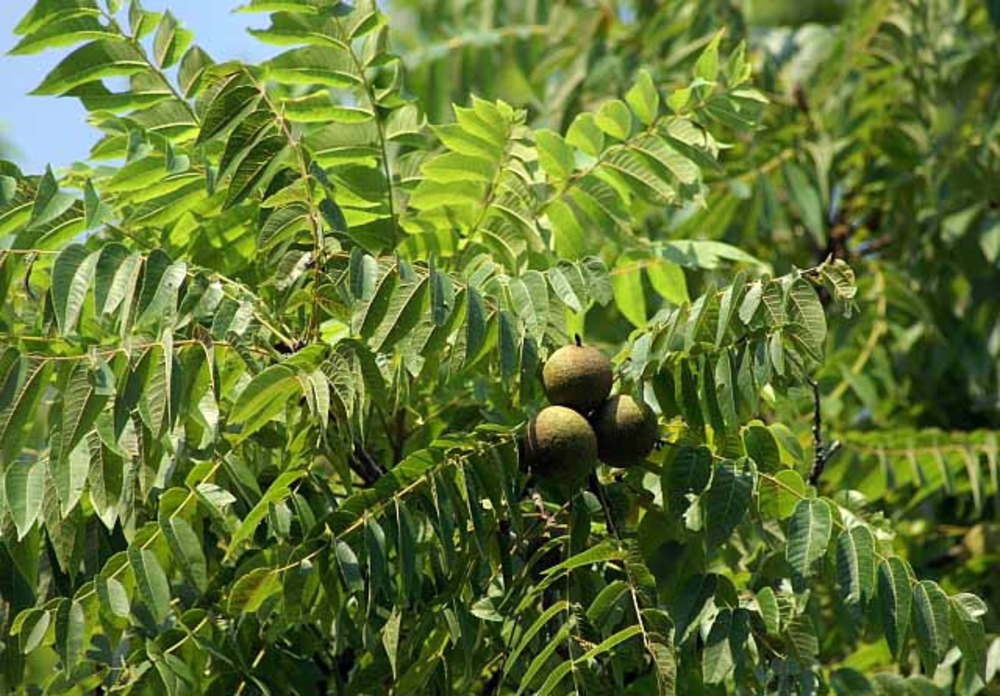 Орех черный - дерево семейства Ореховые. Очень высокое. Его высота достигает пятидесяти метров. Кора ореха чёрного имеет тёмный, практически чёрный цвет, её пронизывают глубокие трещины. Каждый из очерёдных непарноперистых листьев вырастает до тридцати-пятидесяти сантиметров и состоит из нескольких продолговатых светлых листочков. Цветение ореха чёрного и распускание его листьев приходится на один и тот же период. Цветки, относящиеся к тычиночным, собираются в серёжки длиною в пятнадцать сантиметров, а пестичные цветки образуют кисти. Плод зелёного цвета может быть шаровидным или грушевидным, в диаметре не более пяти сантиметров.Ядра этого ореха можно употреблять в пищу.