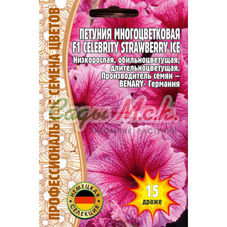 Петуния Celebrity один из самых популярных однолетников с длительным периодом цветения. Растение раскидистое, густолистное. Цветки крупные, разноцветные, до 8 см в диаметре с бахромчатыми краями, душистые. Цветет рано, обильно. Петуния светолюбивая, засухоустойчивая. Отличается жаростойкостью и дождеустойчивостью одновременно