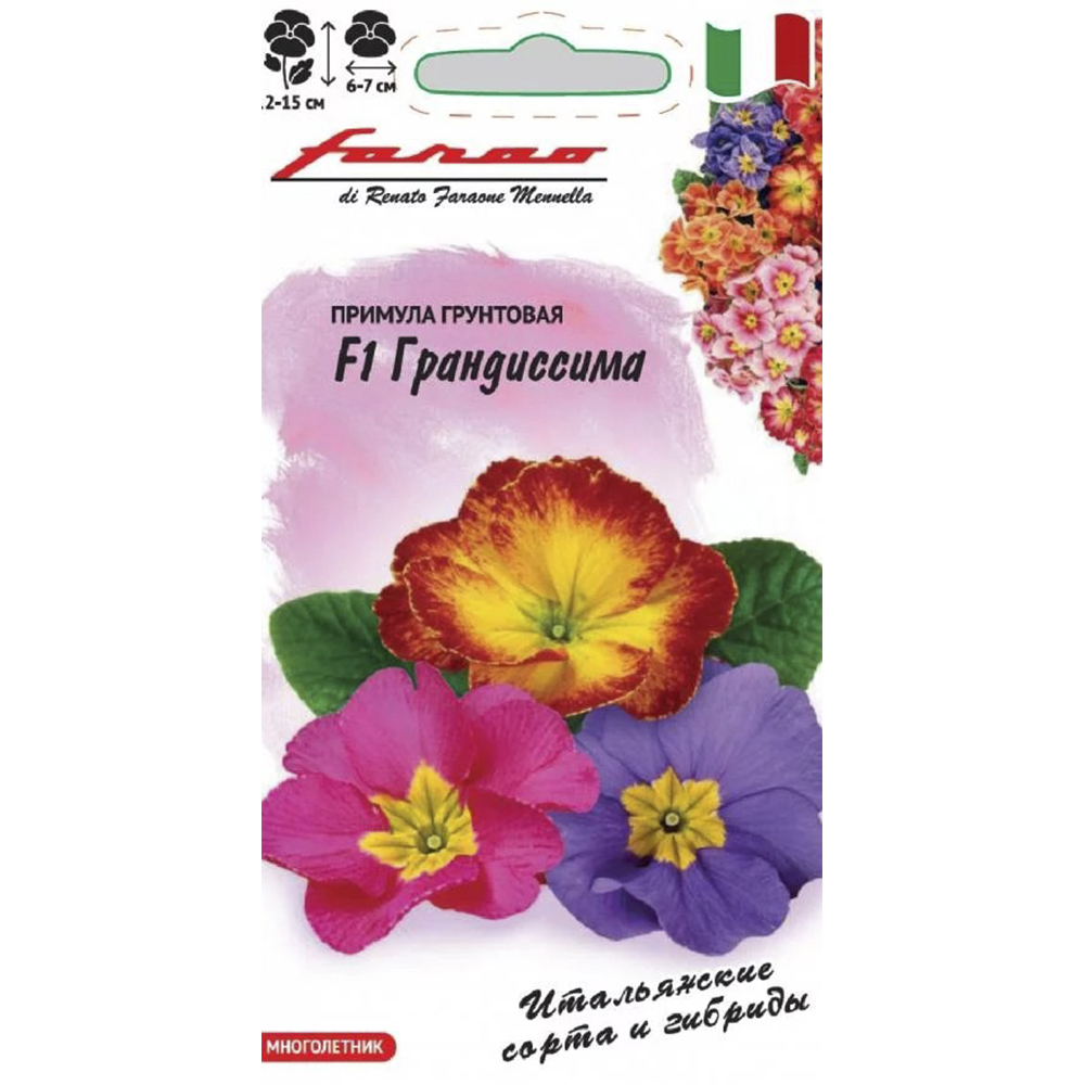Травянистая многолетняя раннецветущая смесь примул с невероятно крупными цветками фантастических двух- и трёхцветных окрасок итальянской серии «Грандиссима». Эти гибриды по праву считаются лучшими для производителей качественных примул. Образуют компактный и очень выровненный кустик высотой 12-15 см усыпанный яркими цветками диаметром 6-7 (до 9!) см. Хорошо растут в полутенистых местах, на удобренной, достаточно увлажненной почве. Легко переносят пересадку даже во время цветения. Семена высевают в открытый грунт осенью или весной после стратификации во влажном песке при низкой положительной температуре, в течение 3-4 недель. При температуре почвы +10°С всходы появляются через 25 дней. На постоянное место высаживают весной или осенью второго года. Высаживать примулу надо с таким расчетом, чтобы посадки были сомкнутыми, а между розетками листьев не было открытого пространства. Молодые растения зацветают на второй год. Цветение продолжительное, с апреля по июль. Используют для посадки в бордюры, каменные горки, а также для зимней выгонки. Растение, пересаженное осенью в горшок, зацветает в комнатных условиях в марте-апреле.