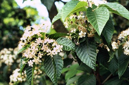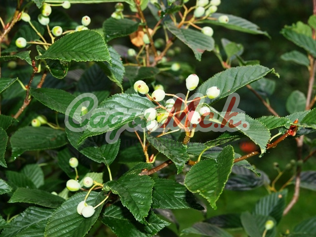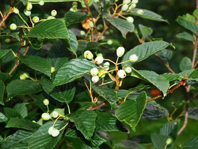 Дерево высотой 5-10 метров с узкопирамидальной кроной. Ствол прямой, высокоочищенный от сучьев, с темно-коричневой, гладкой, глянцевитой корой. Молодые побеги коричневато-красные, блестящие. Листья простые, плотные, крупные (до 10 см), широкоовальные, с резко выраженным жилкованием, по виду напоминают листья ольхи. Весной - светло-зеленые с бронзовым налетом, летом - темно-зеленые, слегка желтоватые снизу, осенью - яркие, оранжево-красные. Цветки ярко-белые, с запахом собраны в немногочисленные щитковидные соцветия. Плоды ярко-красные с сизоватым налетом, суховатые, жесткие. Темп роста медленный.