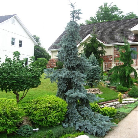 Ель колючая Glauca Pendula отличается необычной формой кроны с плакучими ветвями и голубой хвоей. Растет довольно быстро до 30 см в год. Высота дерева зависит от высоты, на которую произведена прививка и формирования ведущего побега. Высота взрослого растения может быть до 8-10 м. Ветви довольно жесткие, образуют эффект каскада, густо покрывают ствол. Нижние ветви низко расположены, практически лежат на земле, плакучие. Хвоя жесткая, плотная, голубовато-зеленая, 1,5-2,0 см, расположена радиально. Красивая голубая окраска хвои сохраняется в течение всего года при посадке на солнечном месте.