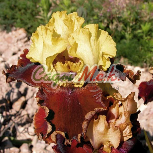 Рассада ириса Acoma относится к высоким бородатым ирисам, известным как пликата, т.е. в которых яркий рисунок располагается на более светлом фоне. Это однократно цветущий ирис, на каждом стебле которого развивается от 5 до 6 бутонов. Нижние доли (фолы) имеют светлый фон цвета слоновой кости и фиолетовые края, мягко переходящие друг в друга. Верхние доли (стандарты) – светло-светло-голубые, вертикально подняты вверх. Бородка – желтая, малозаметная. Верхние и нижние доли слегка гофрированные. Цветение среднее.
