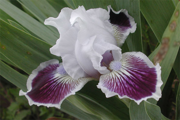 Рассада ириса Puddy Tat относится к сортам стандартных карликовых ирисов. Высота цветоносов данного сорта составляет 33 см. Сорт обладает запоминающейся контрастной окраской. После одного просмотра его легко узнать среди большого количества различных сортов. Верхние доли (стандарты) - серебристо-белые, слегка голубоватые, глянцевые, ровно окрашенные. Нижние доли (фолы)- состоят из серебристо-белого основания, сине-черной основной части и широкой, с ровными краями белой каймы. Цветение – позднее.