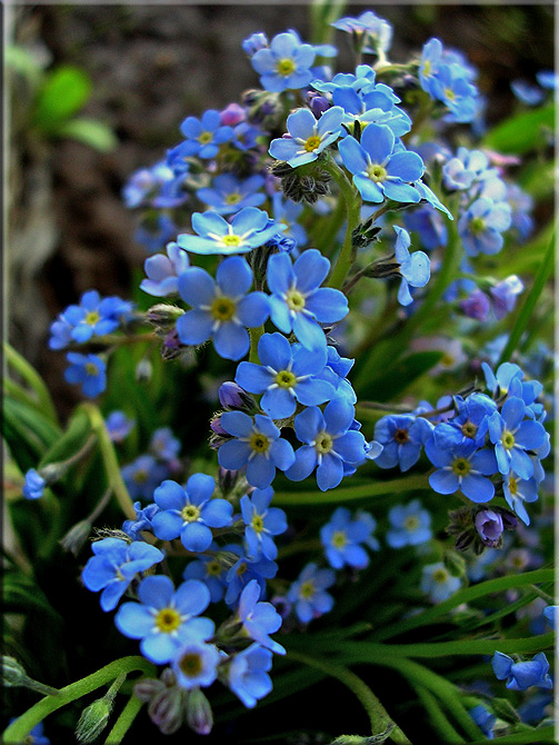 Незабудка — крошечный, скромный и нежный цветок, который по праву считается украшением лугов и полей. Разрастаясь довольно большим ковром, растения создают узорчатую лужайку необыкновенной красоты. Не удивительно, что цветоводы воспринимают незабудку не как сорняк, а используют ее в декоративных целях на своем участке, а также для оформления балконов и получения срезки. Многолетнее растение из семейства Бурачниковые, культивируемое как двулетник, радует своим цветением в мае-июне. Цветки многочисленные, эффектной насыщенно-голубой окраски. Предпочитает полутенистые участки с влажной, плодородной почвой. Выращивают посевом в грунт. Семена высевают поверхностно, не заделывая, в мае-июне. Для получения дружных всходов семена необходимо стратифицировать при температуре +10оС. На постоянное место растения высаживают в конце августа или весной следующего года. Хорошо переносит пересадку. Используется для весеннего оформления цветников и балконов, для получения срезки.