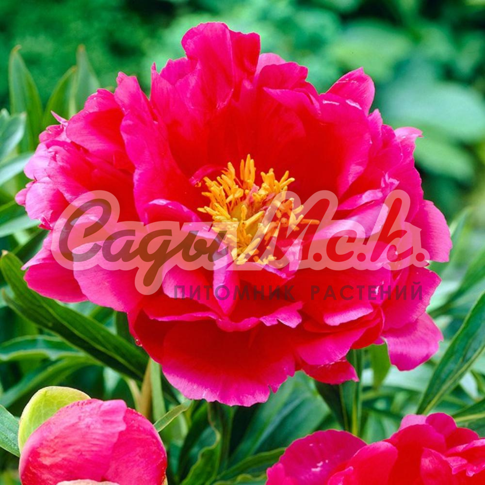 Травянистый пион Doreen японской формы с лёгким сладким ароматом. Лепестки округлые двухрядные, изумительного амарантового цвета. Стаминодии очень крупные затейливо завиваются, розовые у основания они выше к краю становятся сливочно-золотыми. В диаметре цветок достигает 18 см, при роспуске от его великолепия сложно отвести взгляд. Компактный и устойчивый куст достигает в высоту 80 см, густо усыпан глянцевой листвой. Цветение обильное и пышное с начала июня.