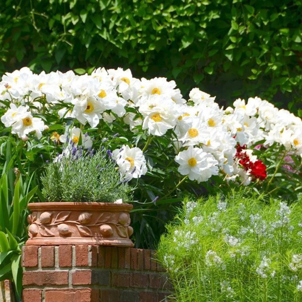 "Травянистый пион Krinkled White -цветок простой, но крупный, вначале нежно-розовый, затем чисто-белый. Срок цветения среднепоздний. Лепестки волнистые и ""жатые"", как креповая бумага. Простая форма цветка создает неповторимый контраст с их центром из желтых тычинок. Цветки необычайно легкие, эффектно смотрятся на кусте, стойко держат ""голову"", не склоняясь, в отличие от многих махровых собратьев. Размер 60-90 см. Цветение в июле."