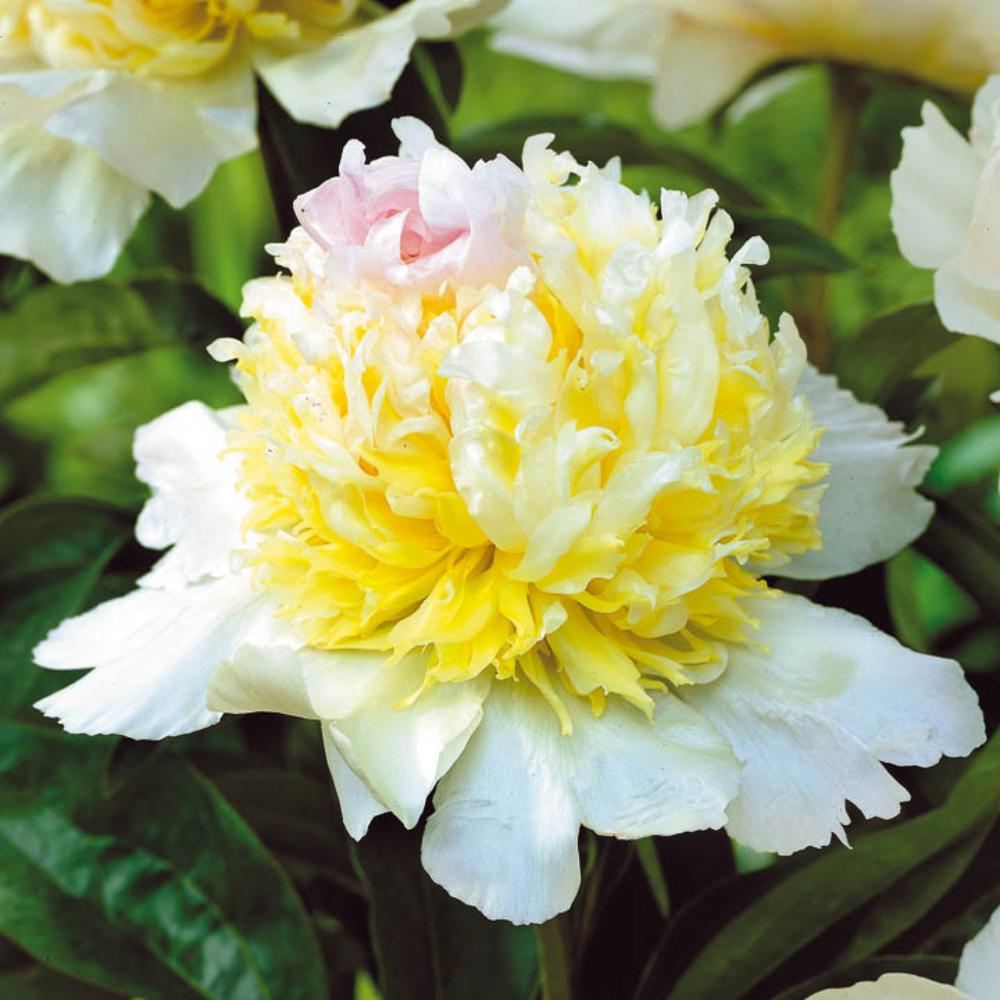 Семена пиона Top Brass – это настоящее украшение для любого сада. Крупные махровые соцветия имеют круглую форму, нижние молочно-белые широкие лепестки словно образуют чашу. На ней располагается шар с игольчатыми лепестками лимонного цвета с белыми вкраплениями. На верхушке лепестки нежно-розовые, а в сердцевине находятся короткие желтые петалодии. Стебли этого травянистого пиона очень прочные, высота куста может достигать девяносто сантиметров. Семена Top Brass неприхотливы в уходе, они могут произрастать на любой садовой почве. Они с легкостью переносят даже самые морозные зимы и резкие перепады температур.