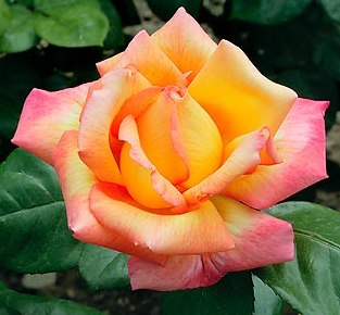 Роза Philippe Noiret - золотисто-желтый цветок с красной каймой, махровый (35-40 лепестков водном цветке). Диаметр цветка 11-12 см, высота растения 80-90 см. Цветение обильное, сорт морозостойкий. Листья зеленые, глянцевые.