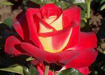 Компактный куст вырастает до 0,8 м в высоту и около 0,6 м в ширину. Прямые, жесткие стебли покрыты темно-зеленой, глянцевой листвой. На цветоносе обычно формируется один бутон. Размер цветка – 8 см. Форма – классическая бокаловидная, даже в роспуске никогда не открывает серединку. Аромат слабовыраженный. Оттенок – желто-красный, изнутри лепестки желтые, а с изнанки – красные. Крупномер Friendship проявляет среднюю устойчивость к черной пятнистости и мучнистой росе. Цветки не боятся дождя.