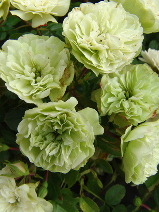 Куст вырастает до 60 см в высоту, раскидистый, покрыт темно-зеленой, блестящей листвой. Диаметр цветов – около 4 см. Бутоны розового цвета, но по мере распускания они белеют, а после приобретают нежный зеленый оттенок. Крупномер Green Ice цветет с раннего лета и до поздней осени несколькими волнами. Цветы собраны в соцветья по 4-7 бутонов, имеют легкий, ненавязчивый аромат. Саженцы хорошо переносят низкие температуры, обладают высоким иммунитетом к болезням. Роза прекрасно себя чувствует в полутени и на солнце.