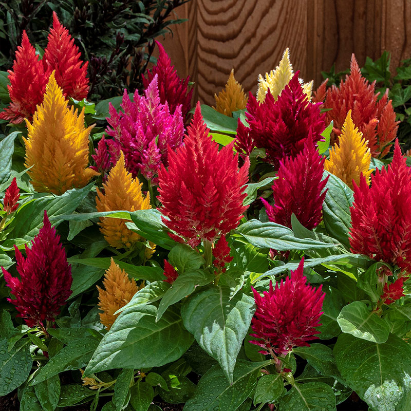 Целозия перистая Кимоно смесь, однолетник. Ярким акцентом для внимания окружающих на цветочной клумбе станет целозия перистая! Растения, хорошо разветвленные, высотой всего около 15-20 см. Соцветия метельчатые, густомахровые красные, бордовые, оранжевые, желтые, кремовые. Цветет с июня и до заморозков. Особенности выращивания: семена высевают в марте в рассадные ящики, увлажняют почву, накрывают пленкой. Глубина заделки семян 0,3 см. При температуре почвы +18-25°с всходы появляются через 14-20 дней. После появления первой пары настоящих листьев сеянцы пикируют по одному. В грунт рассаду высаживают, когда минует угроза весенних заморозков. Расстояние между растениями 15-20 см. Теплолюбивое и светолюбивое растение, достаточно засухоустойчивое. Хорошо растет на рыхлых плодородных почвах. Применение: используют для ковровых цветников, балконных ящиков, контейнерной посадки, в флористическом искусстве.