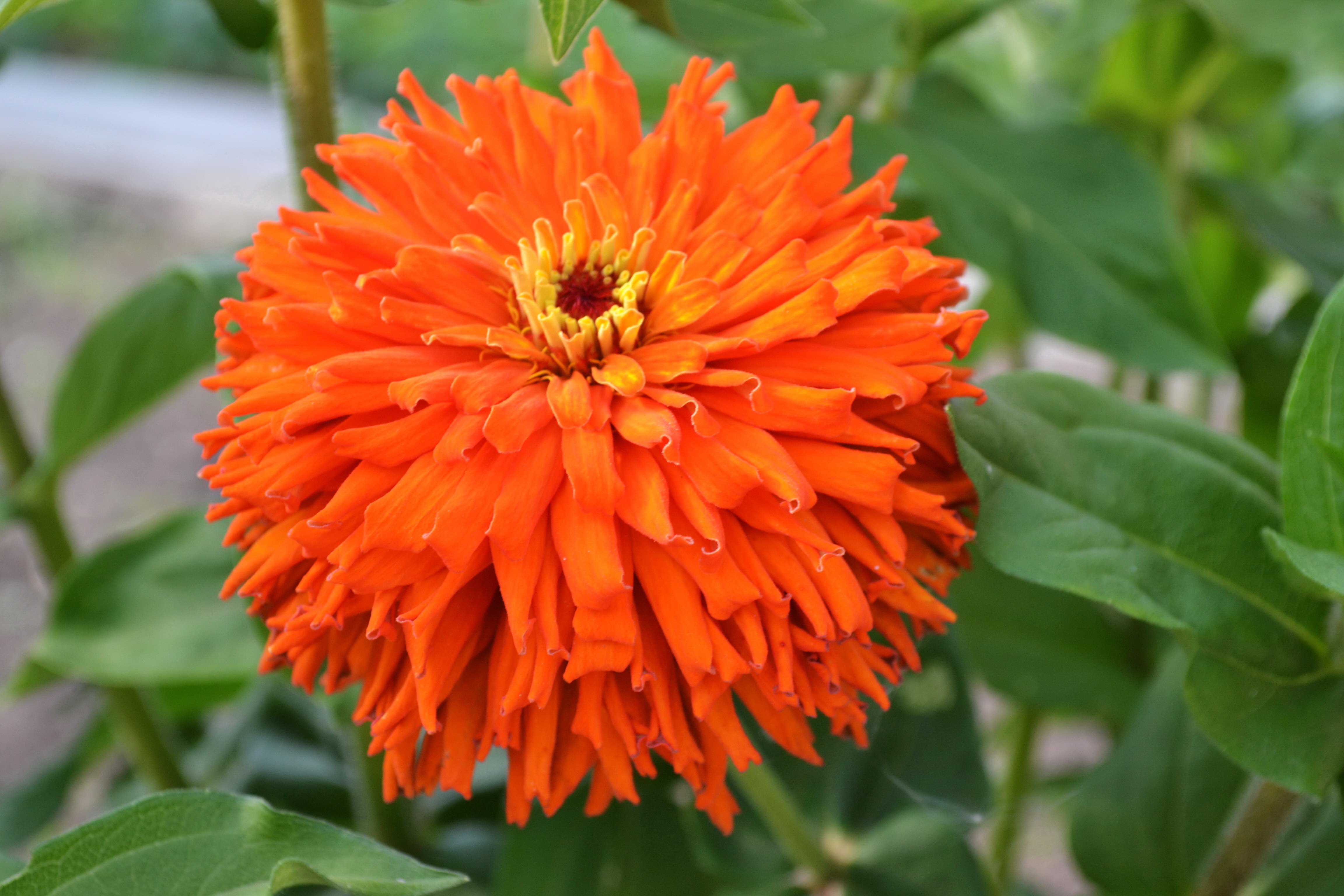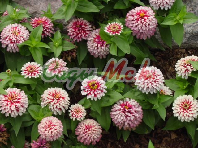 Однолетник. Растение высотой 65-75см с крепкими прямыми цветоносами. Соцветия кактусовидные, очень крупные, 14-15 см в диаметре, красно-оранжевого цвета. Цветение раннее и обильное, длится с июля до заморозков. Циннию используют для посадки в сборные цветники, рабатки, клумбы и на срез для букетов.