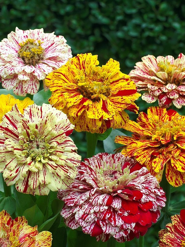 Эффектное прямостоячее растение с прочными цветоносами высотой до 90 см. Соцветия крупные, георгиновидные, белого, желтого и кремового оттенка с оригинальным рисунком на лепестках в виде красных штрихов. Цветение обильное и продолжительное, с июня до глубокой осени. Цинния светолюбива, засухоустойчива и теплолюбива, боится заморозков. Предпочитает плодородные рыхлые почвы, обильный полив в период цветения. Выращивают рассадным и безрассадным способом. Украсит высокие цветники. В срезке долго сохраняет декоративные качества.