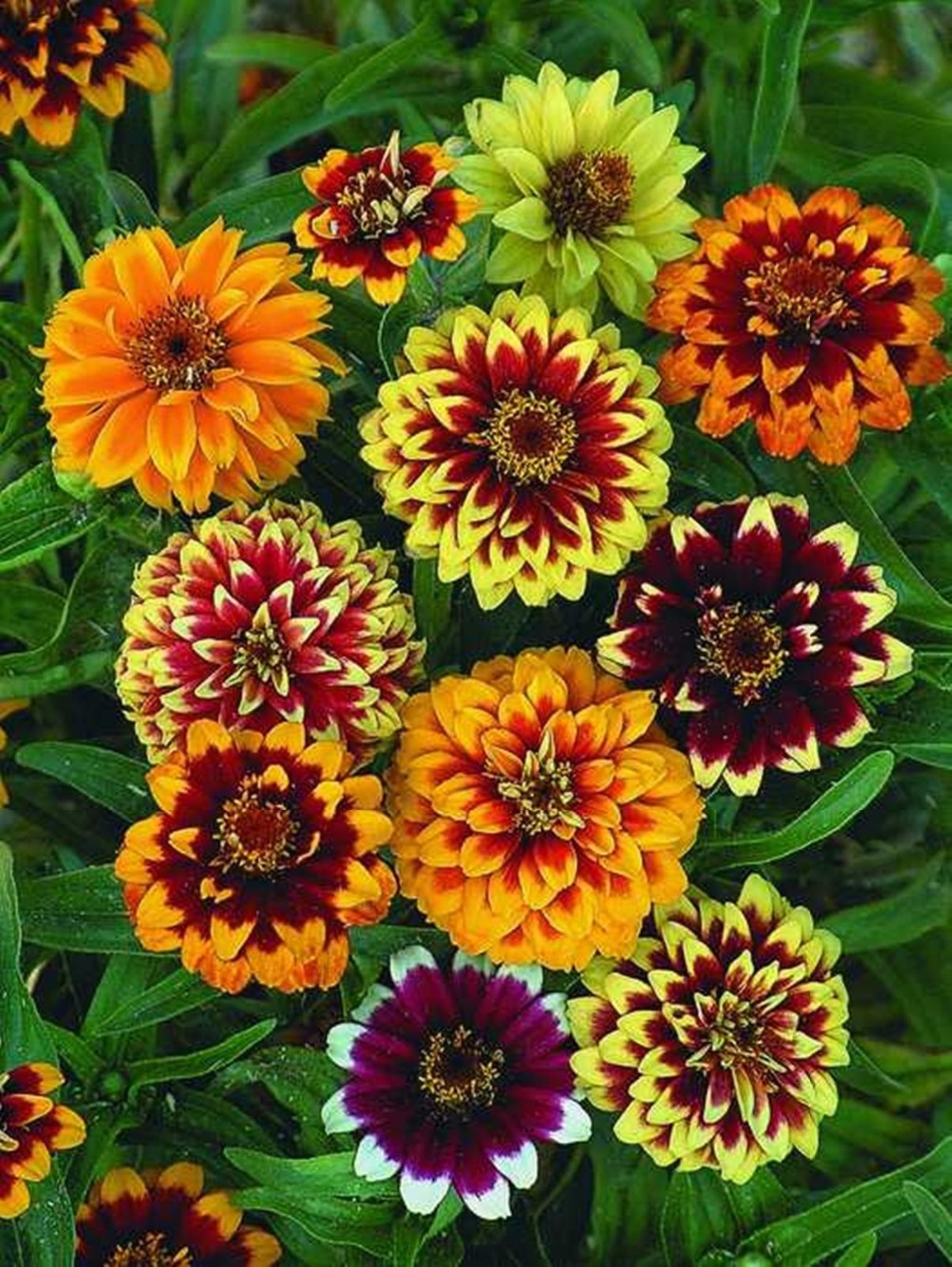 Цинния Persian Carpet - свето- и теплолюбивое быстрорастущее растение высотой до 30 см. Махровые соцветия желтых, коричневых и красных оттенков с контрастными пятнами на концах язычковых цветков. Достигают 5 см в диаметре.