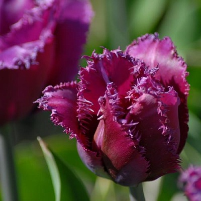 Тюльпан Travellers - растение средней высоты. Длина стебля 35 см. Цветок бахромчастый, махровый. Окрас лепестков фиолетово-розово-пурпурный. Бахрома густая, игольчастая.